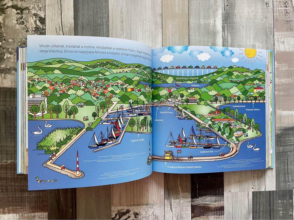és részletgazdag rajzok segítségével kalauzolja végig óvodáskorú olvasóit a magyar tenger nevezetes helyszínein.